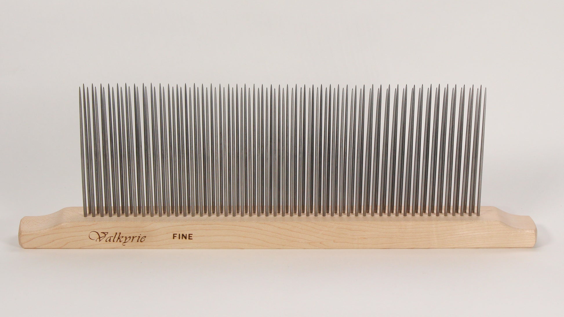 The polished, hardened steel tines are 3/32″ diameter, about 4 1/4″ long, and set 1/4″ on center in two rows, mounted in an unfinished hard maple base. The total length of the hackle is about 16" with a working width of 12".