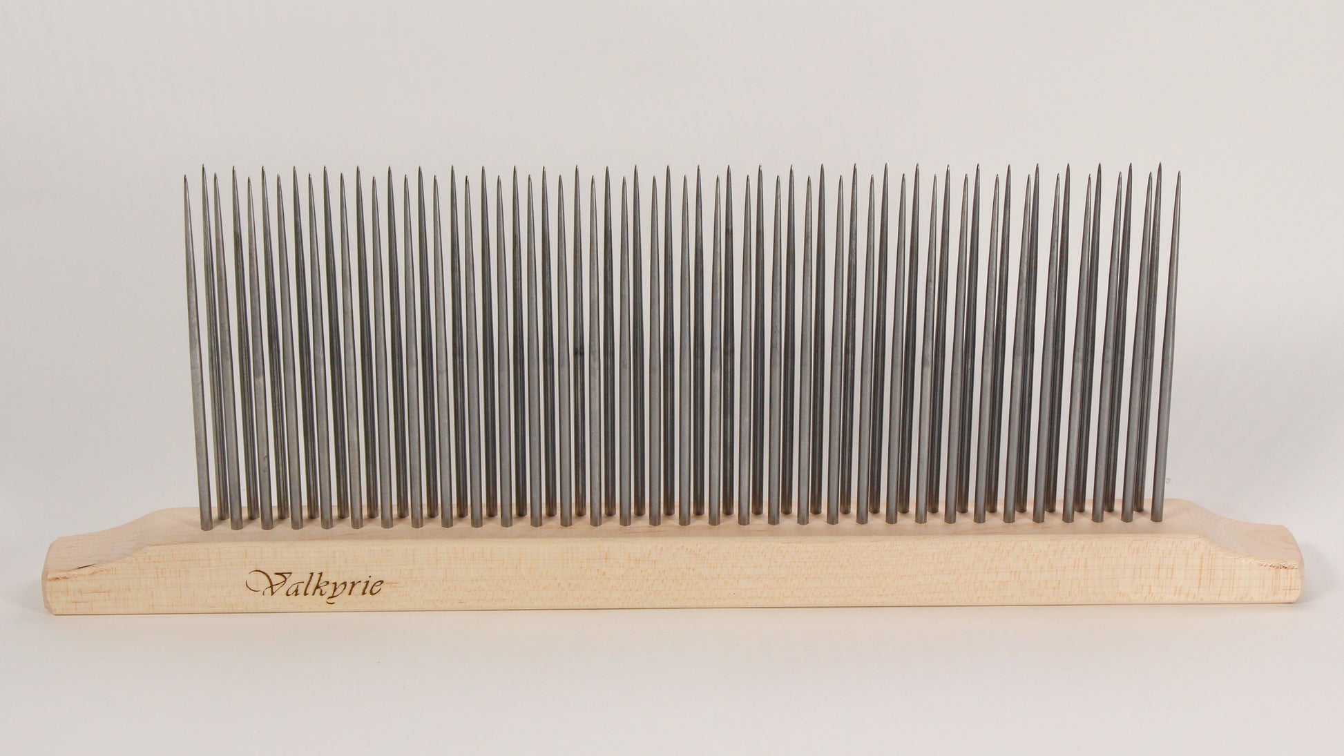 Two rows of polished, hardened steel tines, 1/8" diameter, about 4.5 inch long and spaced 3/8" apart on center, mounted in an unfinished hard maple base.